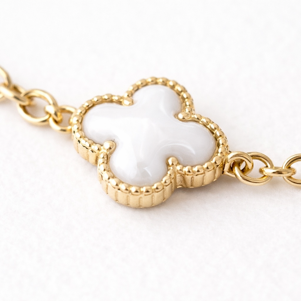Brățară elegantă din aliaj metalic placat auriu, decorată cu trifoi albi lucioși, simbol al norocului și al rafinamentului. Lanț fin, cu închidere sigură și extensie pentru mărime reglabilă, adaptabilă oricărei încheieturi. Aspect premium, cu un contrast elegant între auriu și negru, ușor de asortat cu alte bijuterii.
