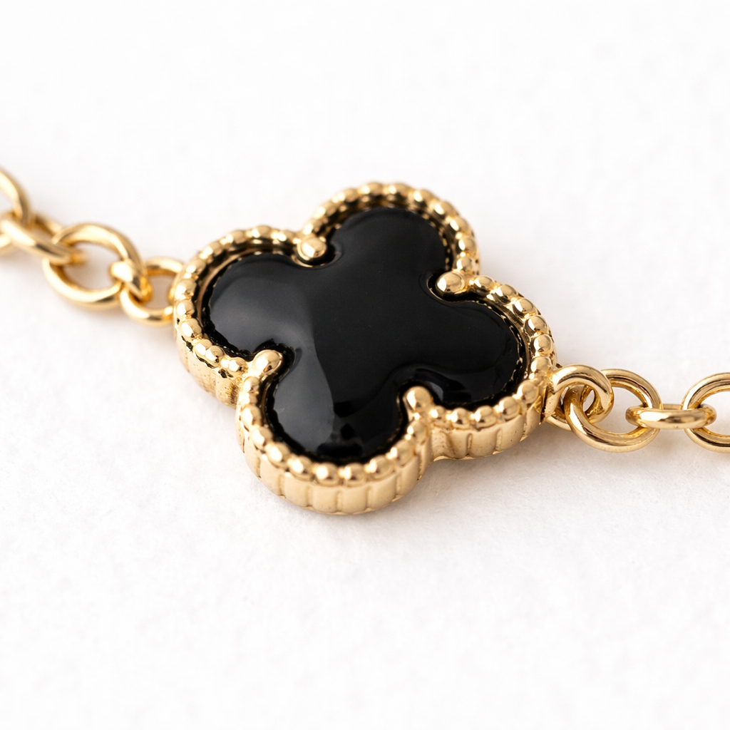 Brățară elegantă din aliaj metalic placat auriu, decorată cu trifoi negri lucioși, simbol al norocului și al rafinamentului. Lanț fin, cu închidere sigură și extensie pentru mărime reglabilă, adaptabilă oricărei încheieturi. Aspect premium, cu un contrast elegant între auriu și negru, ușor de asortat cu alte bijuterii.