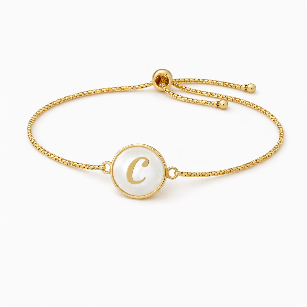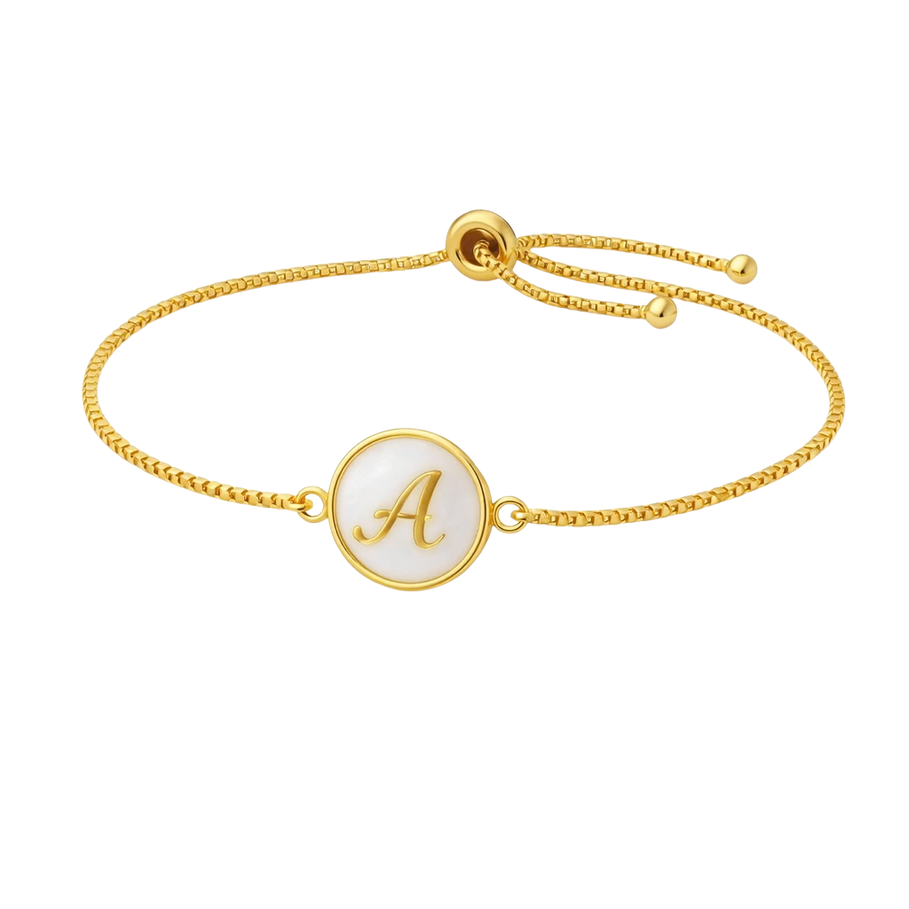 Brățară cu inițială din oțel inoxidabil, cu pandantiv rotund cu aspect sidefat și finisaj auriu rezistent. Designul ajustabil oferă confort la purtare, iar stilul minimalist o face potrivită atât pentru ținute de zi, cât și pentru apariții de seară. O brățară personalizată, ideală pentru cadou, cu inițiale disponibile de la A la S.